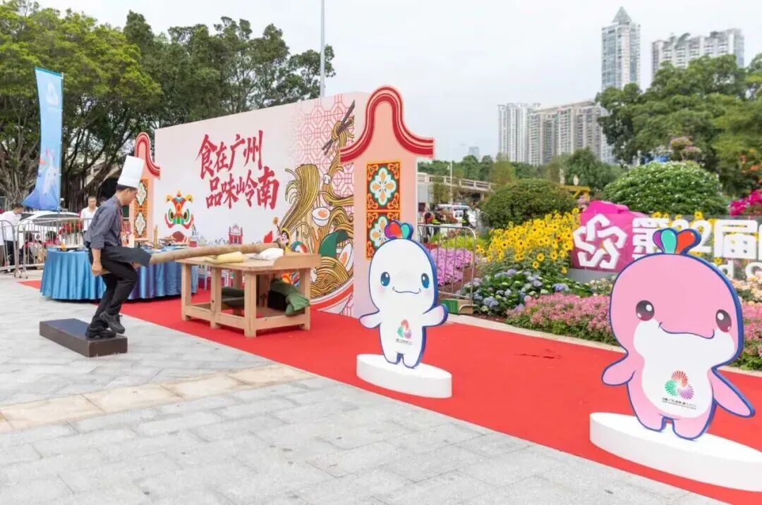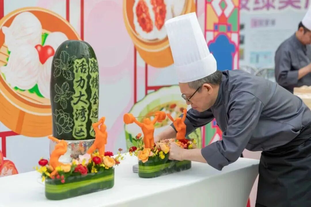 现场集中呈现多种粤式烹饪技艺,全方位展现广府美食魅力:师傅现场制作虾饺,传递广式“一盅两件”的悠闲精致;师傅托着红皮赤壮的烤乳猪,金红油亮的色泽,象征着体育事业的红火兴旺与运动员们的满腔热血;其作为“红袍加身”的隆重宴席主角,寄托了对参赛健儿金榜题名、勇创佳绩的美好祝愿;非遗竹升面的制作展示同样令人瞩目——师傅骑跨竹竿反复弹压,使面团松软劲道。 瓜雕技艺更是巧夺天工,在冬瓜上刻出“激情全运会,活力大湾区”口号,配以粤港澳三地市花点缀,引人赞叹。